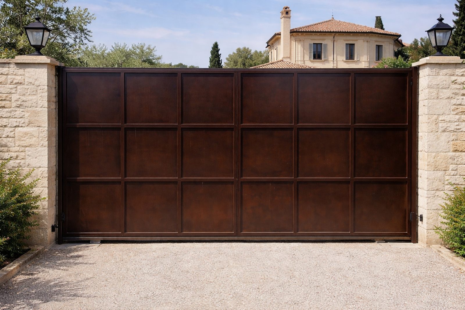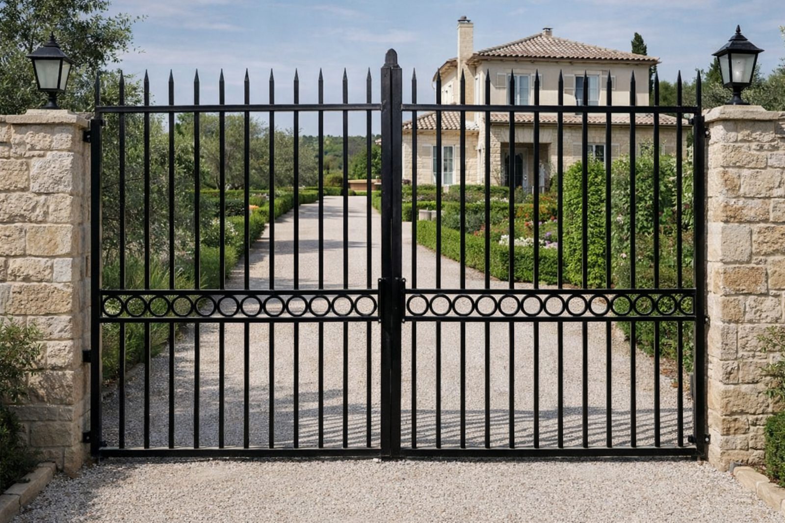 Portails fer forge, lignes contemporaines, options coulissantes ou portillons assortis selon les besoins.